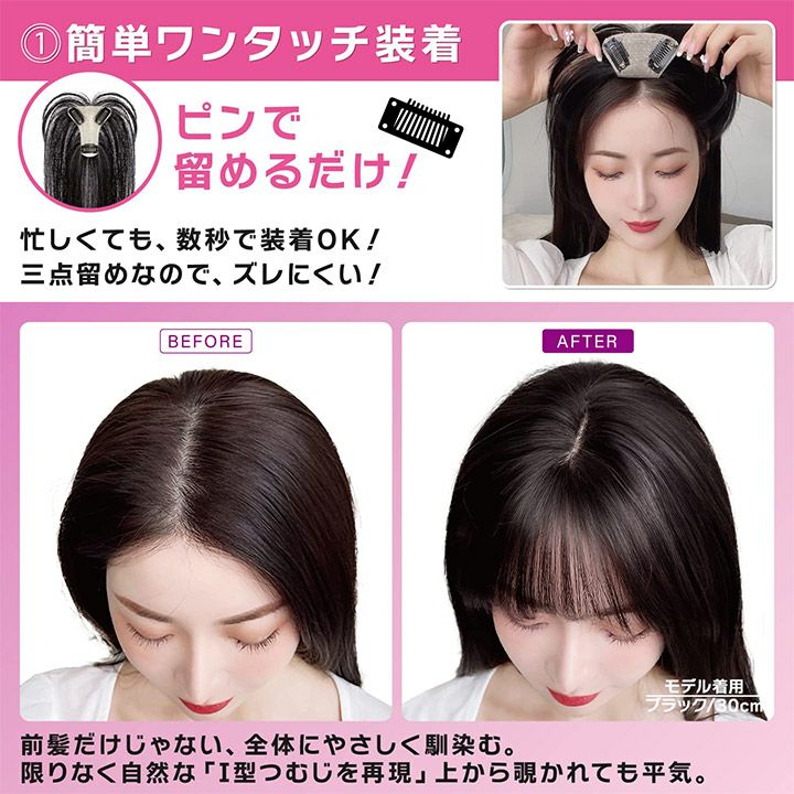 【頭頂部用の部分ウィッグです。】 ●フルウィッグの装着感が苦手な方に試して欲しい! ワンタッチピンで留めるだけ。締めつけやツッパリ感を軽減し 長時間着けていても疲れにくいのが魅力です。 ●人工繊維と侮るなかれ! 「限りなく人毛に近い質感」の再現にこだわりました。 ウィッグ特有のテカリを抑える特殊加工を施しているので、 地毛とウィッグの境目が自然。 ●髪のお悩みに 頭頂部周りを自然にボリュームアップ。 髪にハリとほどよいツヤ感が出るので、お顔周りを明るい印象に見せてくれます。 「前髪ウィッグ」「ダメージヘアカバー」「ボリュームアップ」「白髪隠し」など、 あらゆる髪のお悩みに寄り添う商品を目指しました。 ぜひ一度お試しください。