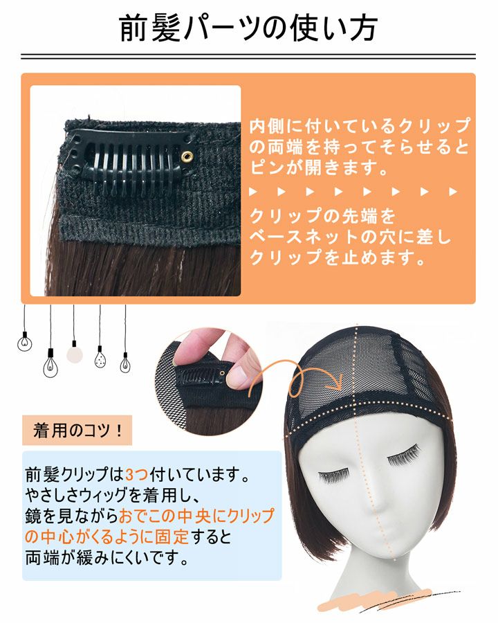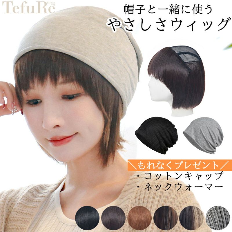 やさしさウィッグは、帽子と一緒に使うウィッグです。 フルウィッグ(全かつら)とは違い、頭頂部の植毛部分をカットし 締めつけ感を軽減しました。 長時間着けていても疲れにくく・頭痛持ちの方にも優しい着け心地です。 おうち時間や急な来客時、近くへお出かけの際にとっても便利! ベースのネットは通気性に優れたメッシュ素材。 夏でも蒸れにくいので、オールシーズンお使いいただけます。 毛材は劣化しにくいファイーバーを使用。 耐熱性ですので、地毛と同じようにヘアアイロンやドライヤーがお使いいただけます。 髪のお悩み・ウィッグの締めつけ感でお悩みの方にぴったりな商品です。 ぜひ一度お試しください。