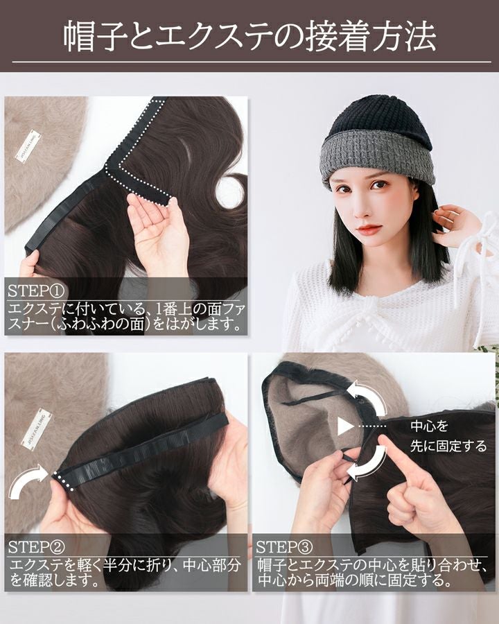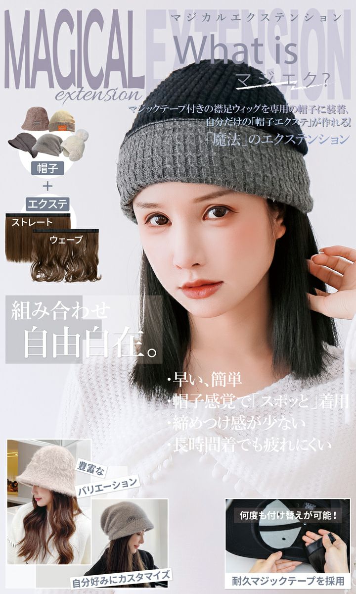 被るだけのお手軽イメチェン! 「髪のことでお悩みなら、マジカルエクステンションをお試しください」 エクステの大革命! 「Magical Extension」略して「マジエク」 マジックエクステとは、マジックテープ付きの襟足エクステを 専用の帽子に付けて、自分だけの「帽子エクステ」が作れる 「魔法」のようなエクステです。 エクステや帽子を付け替えて、何度でも楽しめます! 帽子感覚で着用ができ、締めつけ感が少なく、長時間着けていても疲れにくい特徴があります。 一度セットしてしまえば、どんなに忙しくても大丈夫! 簡単にお洒落髪に大変身! 様々なバリエーションにも注目! 手軽に楽しめるMagic Extension「マジエク」を、ぜひお試しください。