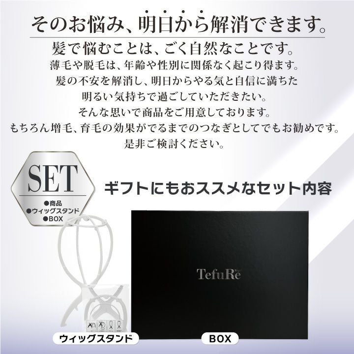 ●一度かぶったら手放せなくなる自然さ、「最高級高品質人毛100%」を使用。 ●「覗かれても安心」革新的な「手編み」技術により「驚くほど自然なつむじと毛の立ち上がりを再現」。 ●男性の思う「このぐらいがいい」「ちょうどいい」を再現したスタイル。 ●「伸縮性」があり、どんな頭の形でもフィットし、「しっかり深くかぶれて」取れにくい。 ●「軽くて、通気性」の良い「メッシュ2重構造」で快適。ラクラク習慣化。 ●「簡単」に装着でき、初めての方にもオススメ。