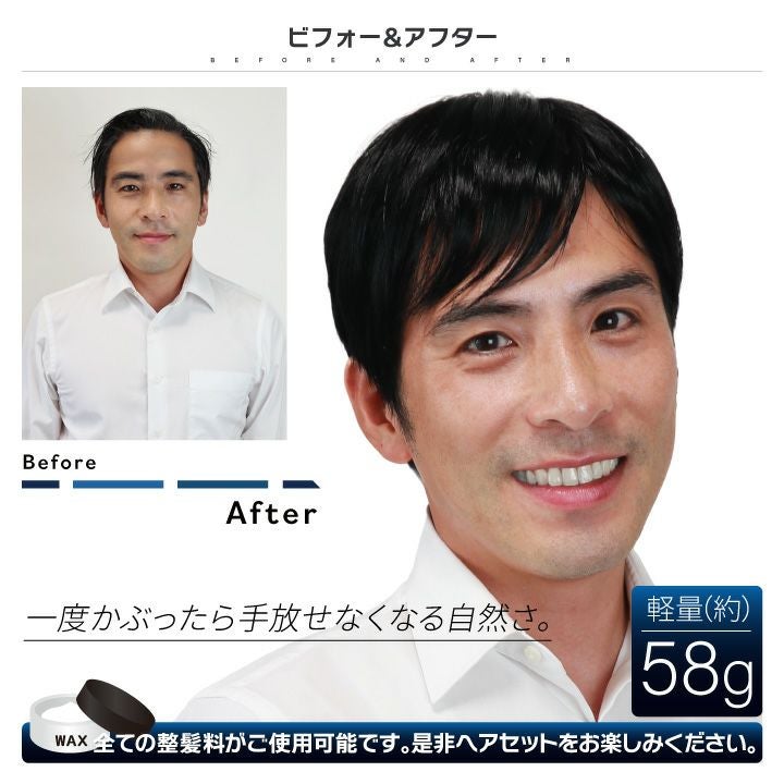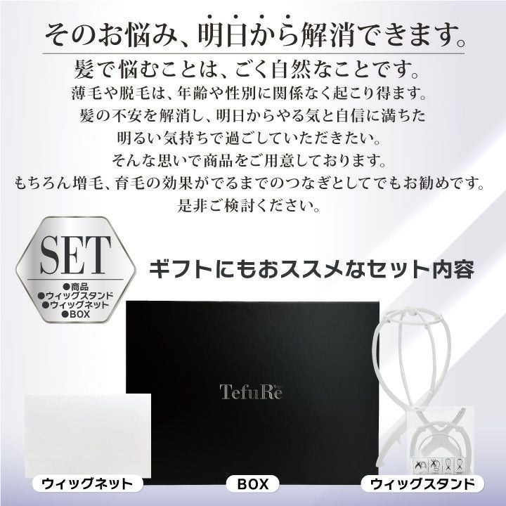 ●一度かぶったら手放せなくなる自然さ、「最高級高品質人毛100%」を使用。 ●「覗かれても安心」革新的な「手編み」技術により「驚くほど自然なつむじと毛の立ち上がりを再現」。 ●男性の思う「このぐらいがいい」「ちょうどいい」を再現したスタイル。 ●「伸縮性」があり、どんな頭の形でもフィットし、「しっかり深くかぶれて」取れにくい。 ●「軽くて、通気性」の良い「シルクメッシュ2重構造」で快適。ラクラク習慣化。 ●「簡単」に装着でき、「10日保証」だから初めての方にもオススメ。