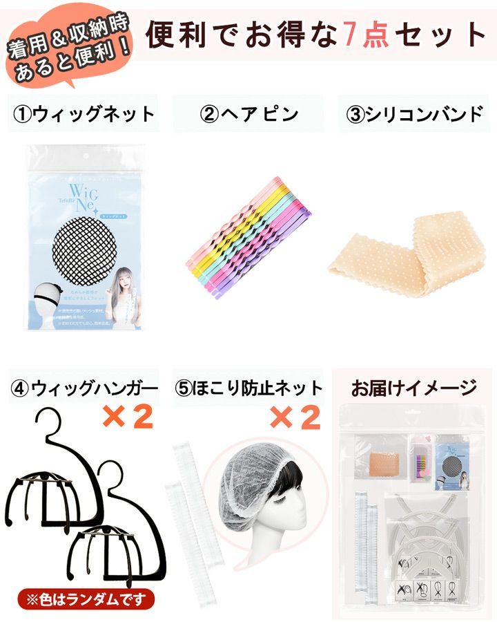 ウィッグネット1個、ヘアピン10本、シリコンバンド1個、ウィッグハンガー2個(※カラーはランダムです)、ホコリ防止ヘアネット2個