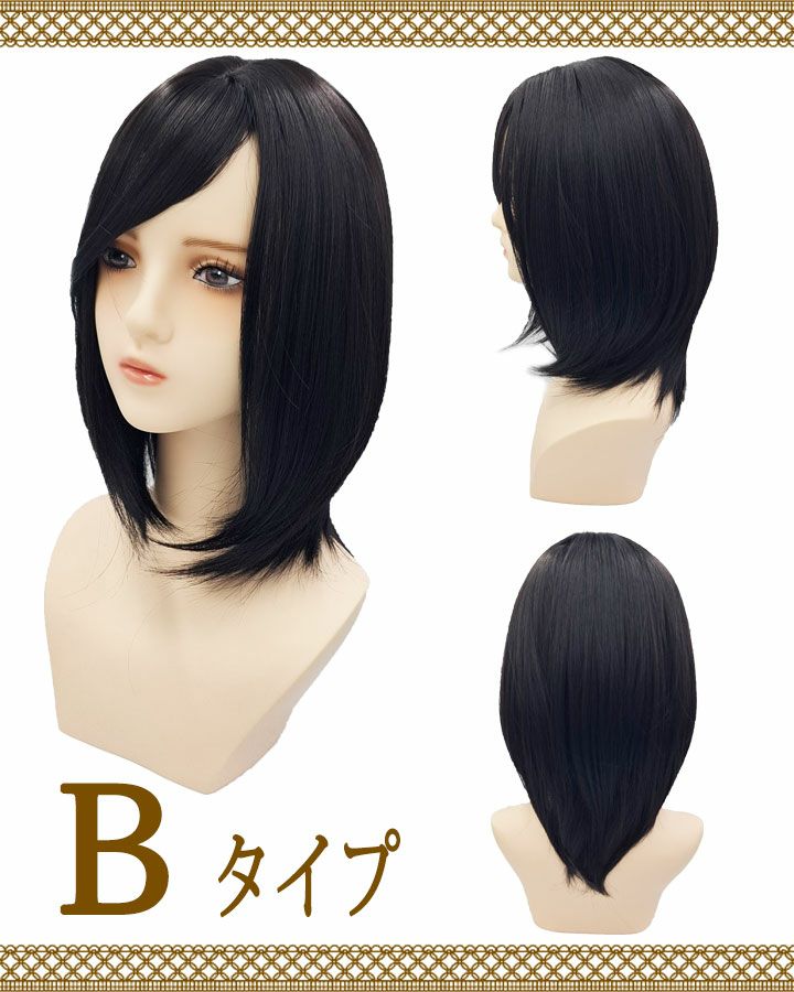 【Aタイプ】 肩下位までの「丁度良い」長さのミディアムウルフレイヤースタイル カラーは馴染みやすいブラックラテを採用。頭頂部はブラック、毛先にかけてほんのりとラテカラーが入っています。 ほぼ単色に近い発色のため、初めての方でも被りやすく扱いやすいウィッグです。 【Bタイプ】 こちらも肩下位までの「丁度良い」長さのミディアムスタイル カラーは馴染みやすいナチュラルブラックを採用。前髪部分は長め仕様のため、 お好きな長さにカット・微調整が可能です。 普段使いはもちろん、コスプレウィッグとしてもお使いいただけます。