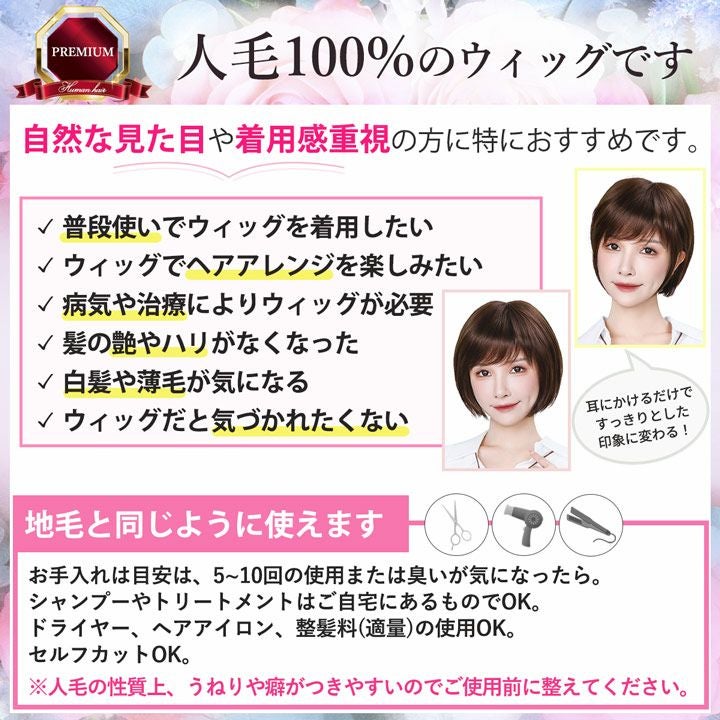 【3/11 01:59までSALE 返品交換不可】医療用ウィッグ 小さめサイズ 人毛 人毛100% ショート ボブ ウィッグ 自然 フルウィッグ レディース ウイッグ かつら 医療用 人毛ウィッグ バレない 可愛い お洒落 抗がん剤 黒 茶 脱毛症 薄毛 普段使い【ふんわりエレガントボブ】