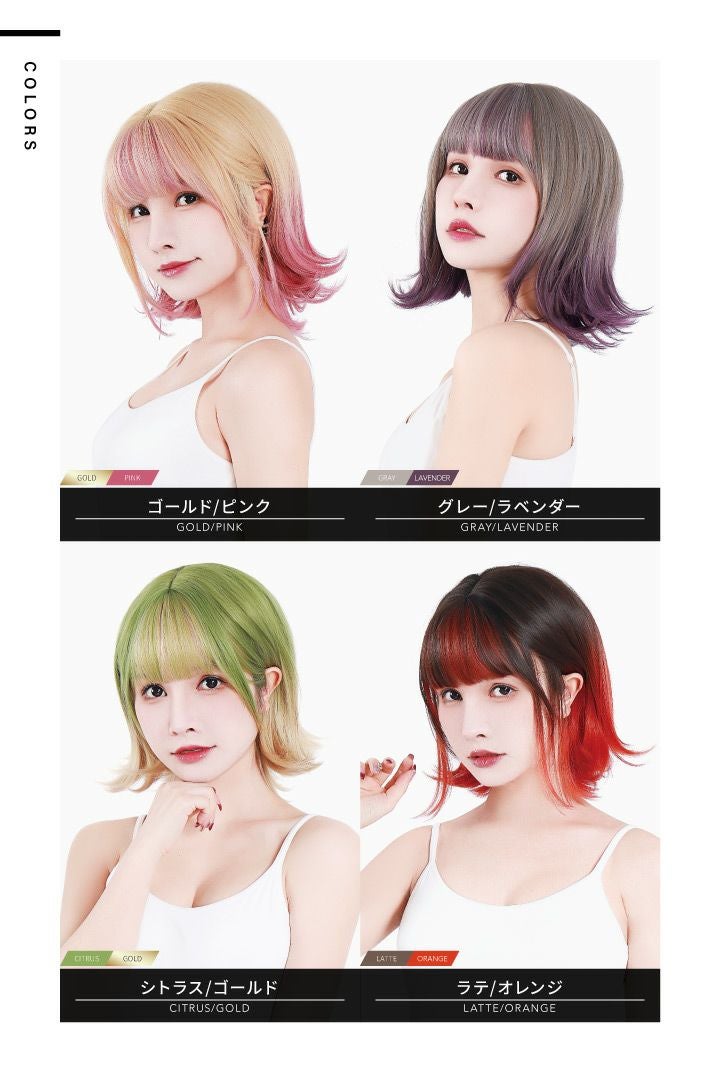 「切らない、染めない、髪のお着替え。」 バングカラーと毛先カラーが両方楽しめるボブです。 前髪と毛先に同色のカラーを入れた、オシャレ見えする外ハネスタイル。 毛先のカラー部分に自然な動きがでて垢抜け度抜群。 首元がメリハリのあるシルエットになるため、 お顔もキュッと引き締まって見えます。 カラー全体はアッシュな仕上がりなので、ナチュラルな質感で悪目立ちしません。 光に当たると程よく自然な光沢が生まれ、 ジューシー感がでて可愛らしい表情を覗かせます。 それぞれのカラーが映えるベースカラーが魅力。 好みに合わせたメイクやファッションをお楽しみください。 艶消し耐熱性ファイバー採用。 美容室で染めたような自然な発色なので、ウィッグだとバレにくい! ドライヤーやヘアアイロンもご使用OK!(推奨温度160度) 巻き髪やストレート、カール付けなどのアレンジも可能です。