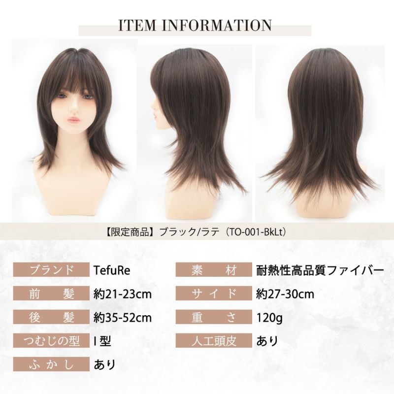 【ブラック/ラテ(BkLt)】 肩下位までの「丁度良い」長さのミディアムウルフレイヤースタイル カラーは馴染みやすいブラックラテを採用。頭頂部はブラック、毛先にかけてほんのりとラテカラーが入っています。 ほぼ単色に近い発色のため、初めての方でも被りやすく扱いやすいウィッグです♪ ナチュラルなウィッグをお探しの方、ぜひ一度お試しください!