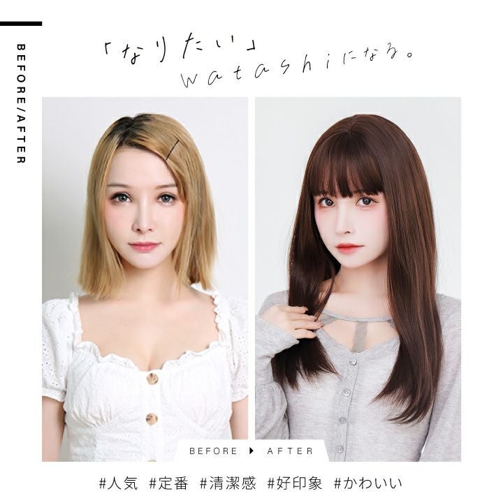 「切らない、染めない、髪を着替える。」 「テフリウィッグで簡単ヘアチェンジ」 SNSリサーチの結果、最も愛されているロングストレート。 【前髪】 前髪は眉下ぱっつんバング。 束感アレンジで透け感のある、シースルーバングにも。 自由度が高く、お好きな前髪スタイルをお楽しみいただけます。 【レングス】 長すぎず、短すぎない胸上までのレングス。 軽く、遊びのある毛先。 SNSリサーチの結果、最も愛されているロングスタイルです。 【シルエット】 広がりを抑えたサラサラ質感が、女性らしさをより印象づけます。 サイドが長めなので、小顔効果も。 全ての角度から見て欲しい、そんなシルエットです。 【つむじ】 限りなく自然な「I型つむじ」を再現。 違和感のない自然な頭頂部で、上から覗かれても安心です。 艶消し耐熱性ファイバー採用。 美容室で染めたような自然な発色を再現しました。 ドライヤーやヘアアイロンもご使用いただけます。 カットもカラーリングも要らない手軽なお洒落を、ぜひお試しください。 個性的なファッションを楽しみたい方や、髪を染められない学生さんにもオススメです。