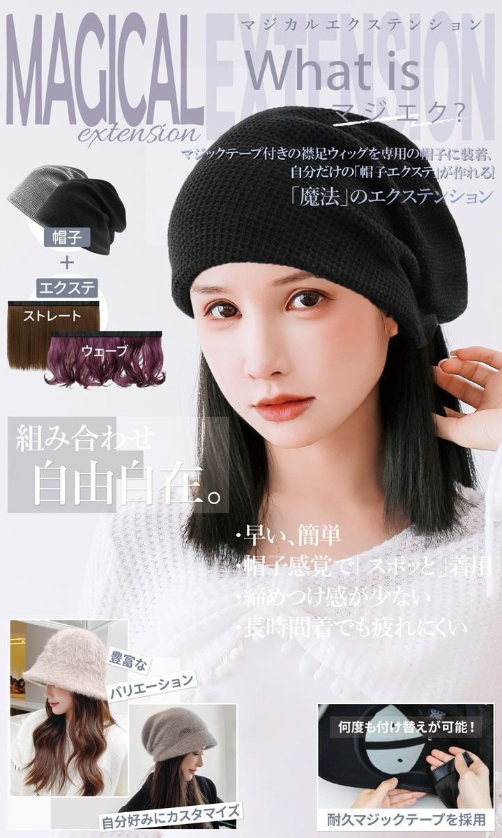 被るだけのお手軽イメチェン! エクステの大革命! 「Magical Extension」略して「マジエク」 マジカルエクステとは、粘着シート付きの襟足エクステを 専用の帽子に取り付けて自分だけの「帽子ウィッグ」が作れる 「魔法」のようなエクステです。 エクステや帽子を付け替えて、何度でも楽しめます! 帽子感覚で着用ができ、締めつけ感が少なく、長時間着けていても疲れにくい特徴があります。 一度セットしてしまえば、どんなに忙しくても大丈夫! 簡単にお洒落髪に大変身! 様々なバリエーションにも注目! 手軽に楽しめるMajical Extension「マジエク」を、ぜひお試しください。