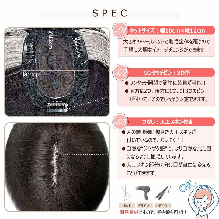ピン無しなのにしっかり留まる!ボリュームアップや白髪隠しにぴったりです。