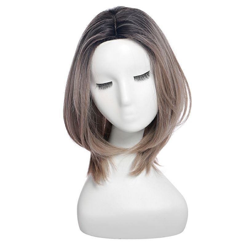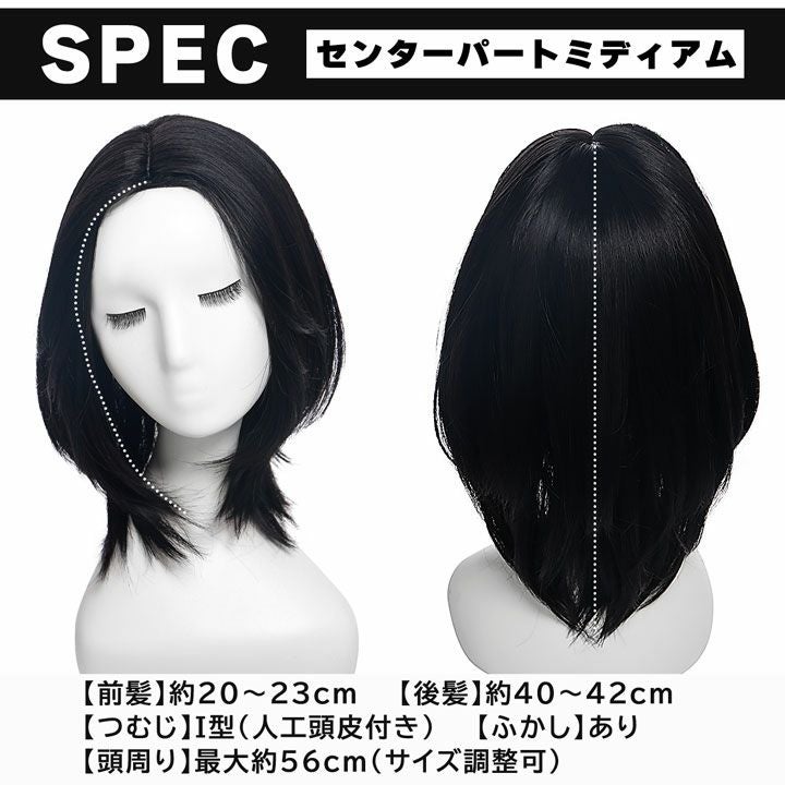 センター分けミディアムスタイルです。 人工頭皮付きのI型つむじなので、 結い上げやハーフアップヘアなど自然に見せることが出来ます。 前髪部分はフカシ加工を施しているので、好みの立ち上げが簡単に作れます。 艶消し耐熱性ファイバー採用。 美容室で染めたような自然な発色なので、ウィッグだとバレにくい! ドライヤーやヘアアイロンもご使用OK!(推奨温度160度) 巻き髪やストレート、カール付けなどのアレンジも可能です。