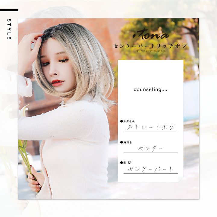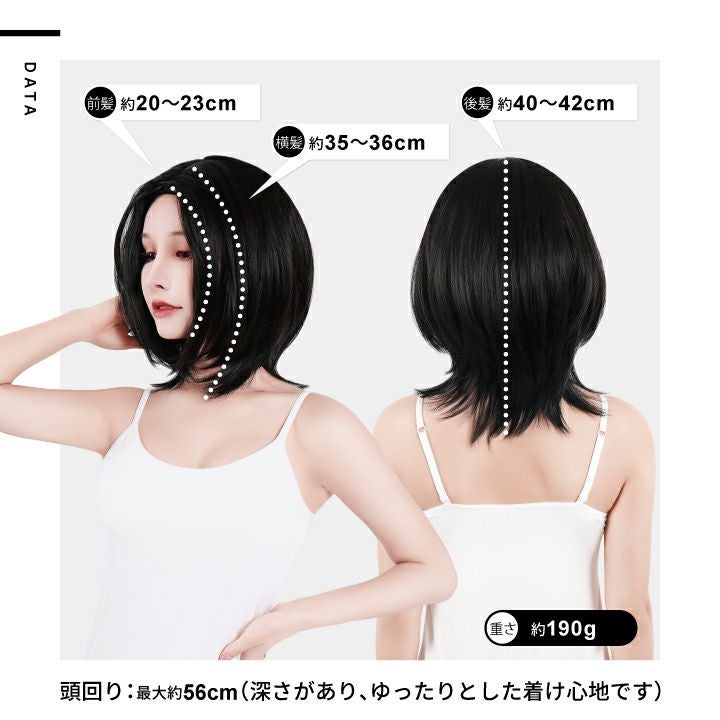 「切らない、染めない、髪のお着替え。」 襟足が長めの大人っぽい雰囲気のあるボブウィッグです。 地毛では挑戦しづらいセンターパートが試せる! 程よい立ち上がりで顔周りを自然に流れる長めのサイド。 小顔効果抜群でカッコいい印象に。 毛先にレイヤーを入れ、襟足を長めにすることで くびれラインができとても綺麗なシルエットに。 肩につく長さの襟足で自然なハネが生まれるので 動きが出てよりお洒落度を高めてくれます。 上品でキレイな遊べる長めのボブスタイルをお楽しみください。 艶消し耐熱性ファイバー採用。 美容室で染めたような自然な発色なので、ウィッグだとバレにくい! ドライヤーやヘアアイロンもご使用OK!(推奨温度160度) 巻き髪やストレート、カール付けなどのアレンジも可能です。