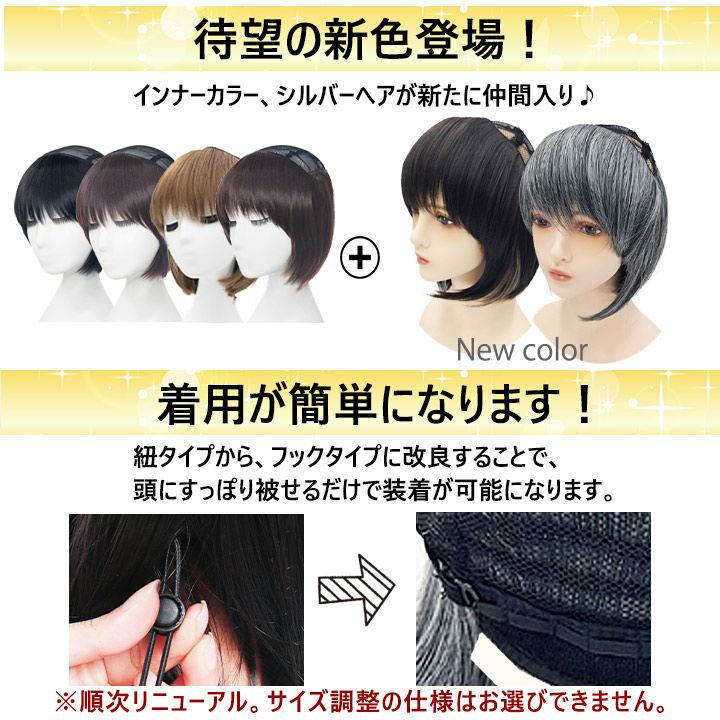 やさしさウィッグは、帽子と一緒に使うウィッグです。 フルウィッグ(全かつら)とは違い、頭頂部の植毛部分をカットし 締めつけ感を軽減しました。 長時間着けていても疲れにくく・頭痛持ちの方にも優しい着け心地です。 おうち時間や急な来客時、近くへお出かけの際にとっても便利! ベースのネットは通気性に優れたメッシュ素材。 夏でも蒸れにくいので、オールシーズンお使いいただけます。 毛材は劣化しにくいファイーバーを使用。 耐熱性ですので、地毛と同じようにヘアアイロンやドライヤーがお使いいただけます。 髪のお悩み・ウィッグの締めつけ感でお悩みの方にぴったりな商品です。 ぜひ一度お試しください。