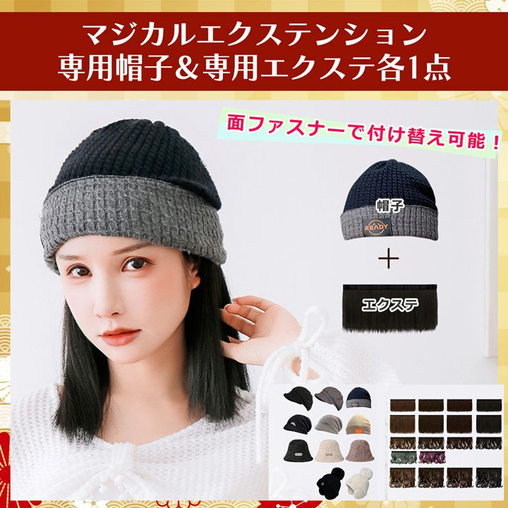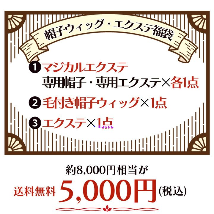 【帽子ウィッグ・エクステ福袋】 スピード装着で手軽にイメチェンが楽しめる便利グッズが福袋になって登場♪ 総額約8,200円相当が5,000円と大変お得になっております。是非この機会にお試しください! ・ウィッグに挑戦したいけど少し不安… ・ウィッグの締めつけ感が苦手 ・美容室行くまでの繋ぎが欲しい! ・白髪や抜け毛を隠したい! といった方に、特にオススメです♪ 数量限定となりますので、気になる方は是非お早めにGETしてくださいね!