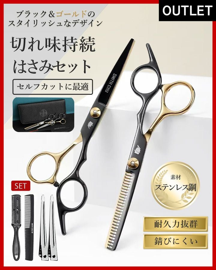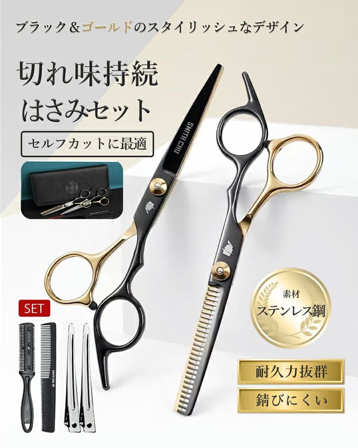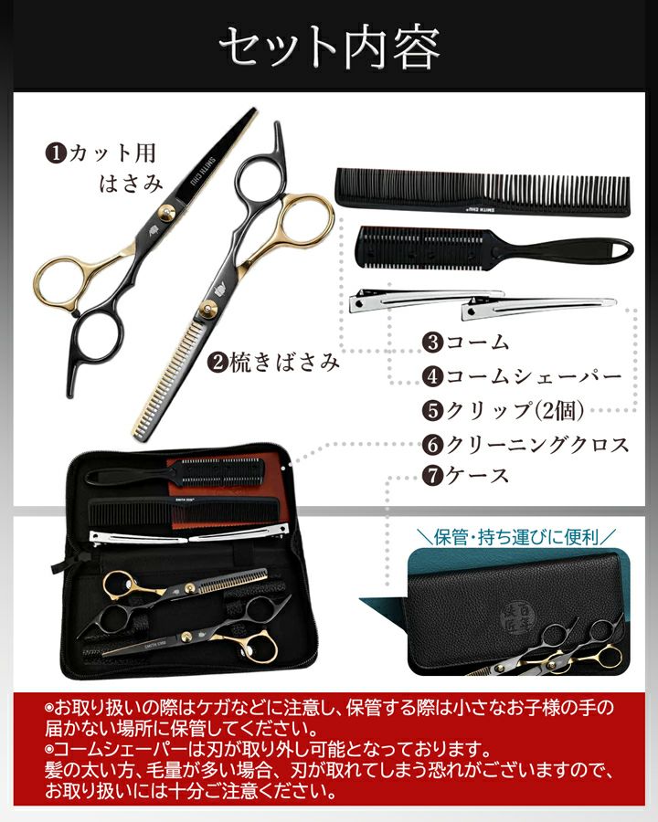 カット用はさみ、すきばさみ、コーム、コームシェーパー、クリップ(2個)、クリーニングクロス、ケース