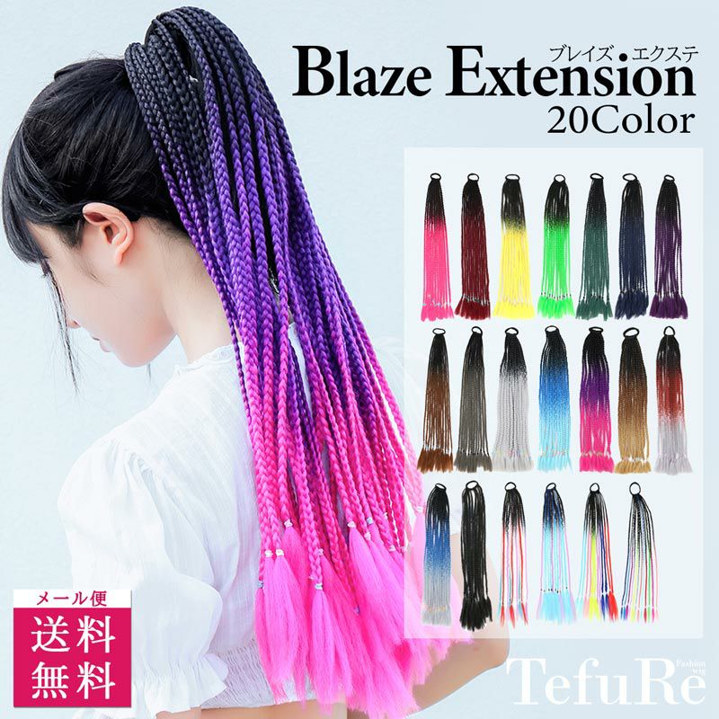 新しい髪型、髪色に! 「切らない、染めない、髪のお着替え!」 近年再熱しているブレイズヘアが登場! イベントにも付けていきたくなるような個性豊かなカラバリ! へアゴム仕様で結ぶだけで、簡単にブレイズヘアにチェンジ♪ 1Dayで楽しめる手軽なヘアグッズです。 オススメは断然重ね付け! 2個以上の組み合わせで、よりキレイで魅力溢れるブレイズヘアになります。 同色同士の組み合わせや、別カラーと組み合わせたりと楽しみ方は無限大! さらに、ビーズやリボンで飾ればイベントやフェスにもぴったりなアレンジに! 一つ結び、二つ結びなどヘアアレンジによって様々な魅力を発揮するブレイズエクステを、ぜひ一度お試しください。