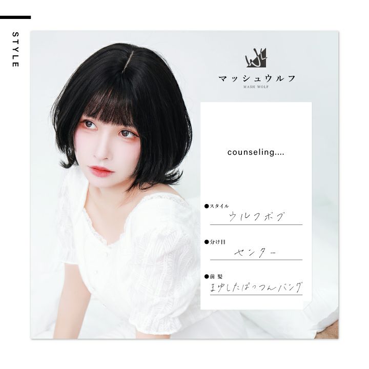 「切らない、染めない、髪を着替える。」 「テフリウィッグで簡単ヘアチェンジ」 マッシュの丸みとウルフのクールさを合わせ持つ、かわいくてカッコいい、オシャレスタイル。 注目商品です。 【前髪】 前髪は眉下ぱっつんバング。 束感アレンジで透け感のある、シースルーバングにも。 自由度が高く、お好きな前髪スタイルをお楽しみいただけます。 【レングス】 肩上までのレングス、襟足の長さが程良くバランスを保ちます。 サイドバングから後まで、メリハリがつきすぎないのもポイント。 【シルエット】 一つ一つスタイリストがカット。 自然なレイヤーがお顔周りを包み、小顔効果も。 【つむじ】 限りなく自然な「I型つむじ」を再現。 違和感のない自然な頭頂部で、上から覗かれても安心です。 艶消し耐熱性ファイバー採用。 美容室で染めたような自然な発色を再現しました。 ドライヤーやヘアアイロンもご使用いただけます。 カットもカラーリングも要らない手軽なお洒落を、ぜひお試しください。 個性的なファッションを楽しみたい方や、髪を染められない学生さんにもオススメです。