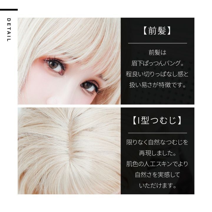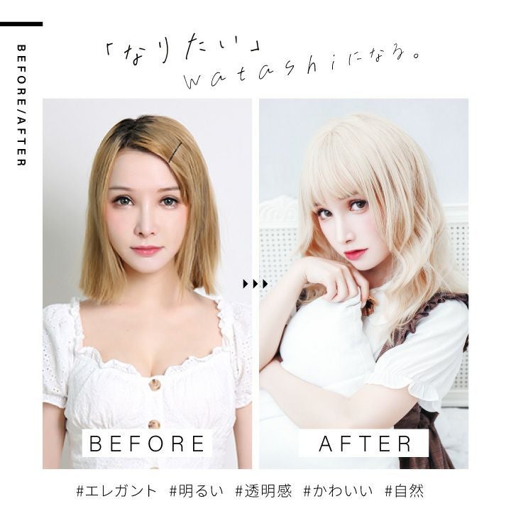 新しい髪型、髪色に! 「ウィッグで簡単ヘアチェンジ!」 重みと軽さのバランスが絶妙な波ウェーブミディ。 前髪は、やや軽めのシースルーバング。 サイド部分はレイヤーを入れ、気になるフェイスラインを上手にカバー。 毛先にシャギーを入れることで抜け感をプラス。 バックスタイルをフラットにしたことで、ウェーブをきれいに見せる効果があります。 艶消し耐熱性ファイバー採用。 美容室で染めたような自然な発色を再現しました。 ドライヤーやヘアアイロンもご使用いただけます。 カットもカラーリングも要らない手軽なお洒落を、ぜひお試しください。 個性的なファッションを楽しみたい方や、髪を染められない学生さんにもオススメです。